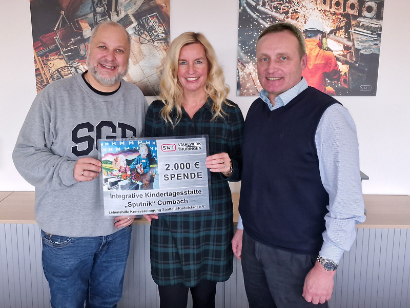 Am Dienstag, dem 16.12.2025, überreichten Sina Neumann, Leiterin Finanz- und Rechnungswesen, und Matthias Falck, Leiter Personal und Sozialwesen, einen symbolischen Spendenscheck in Höhe von 2.000 Euro an Benjamin Hahn, den pädagogischen Vorstand der Lebenshilfe-Kreisvereinigung Saalfeld-Rudolstadt.